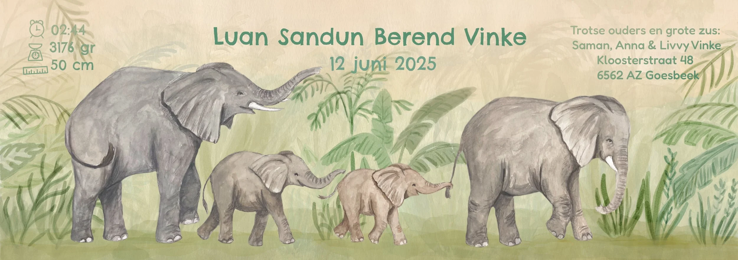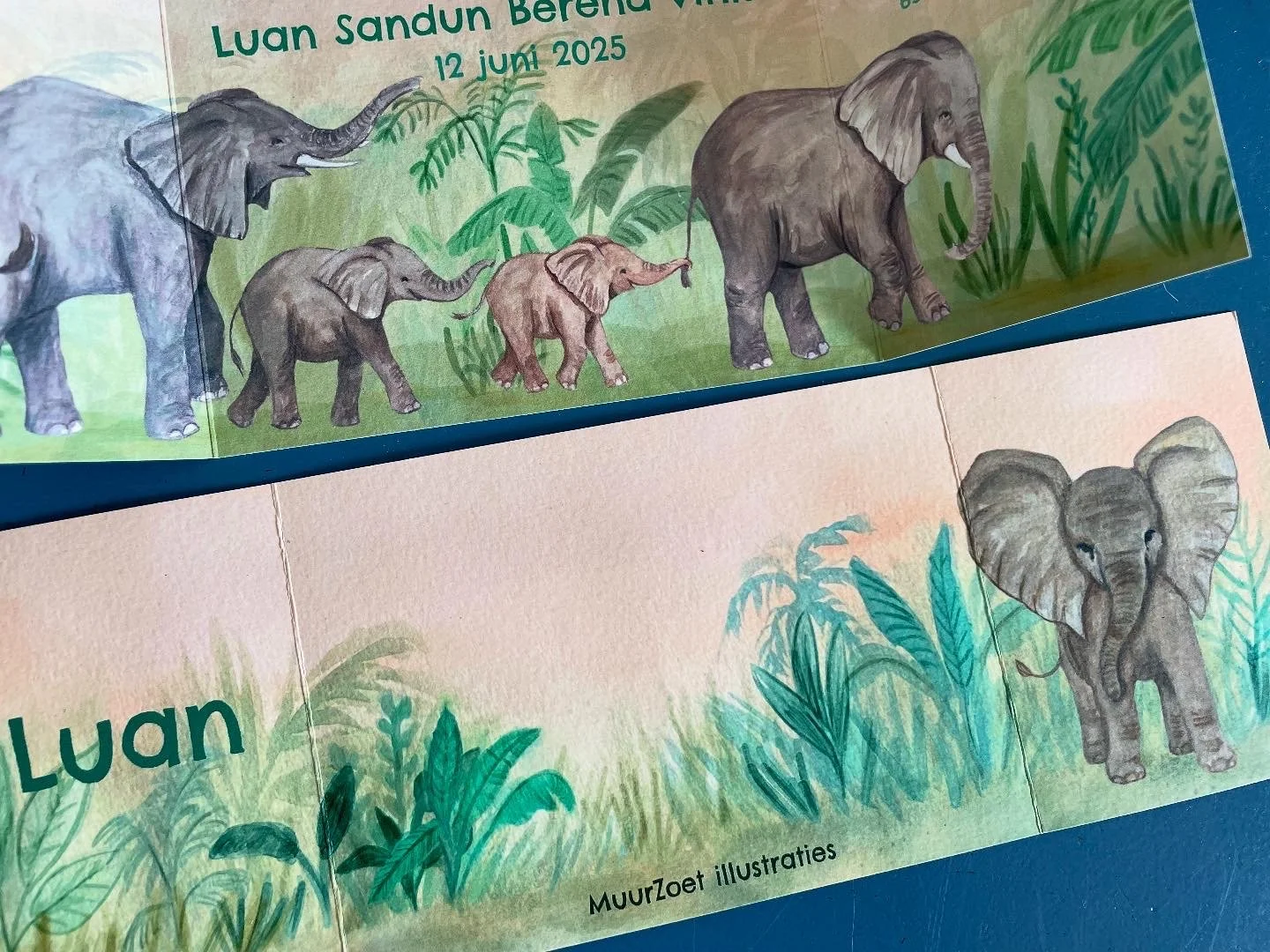 Een persoonlijk en op maat gemaakt geboortekaartje met olifantjes, in luikvouwkaart vorm. Een leuke verrassing als je de kaart open vouwt! Handgeschilderd met aquarel en guache, digitaal nabewerkt en als geboortekaartje geprint.